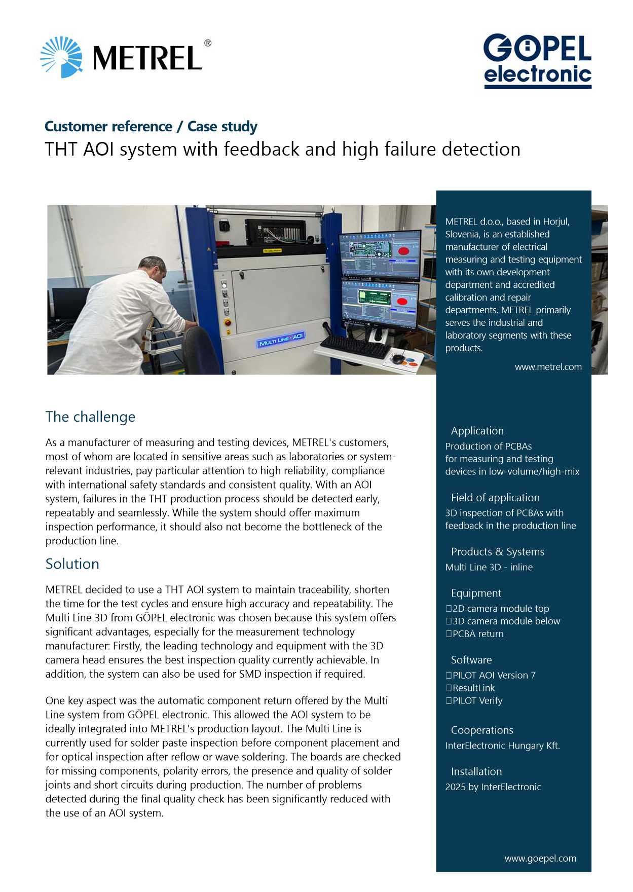 Mint mérő- és tesztberendezések gyártója, a szlovéniai METREL ügyfelei – akiknek többsége érzékeny területeken, például laboratóriumokban vagy rendszerkritikus iparágakban tevékenykedik – különös figyelmet fordítanak a magas megbízhatóságra, a nemzetközi biztonsági szabványok betartására és az állandó minőségre. Egy AOI rendszer segítségével a THT gyártási folyamatban előforduló hibákat korán, ismételhetően és megszakítás nélkül kell észlelni. A rendszernek a lehető legmagasabb ellenőrzési teljesítményt kell nyújtania, miközben nem válhat a gyártósor szűk keresztmetszetévé.